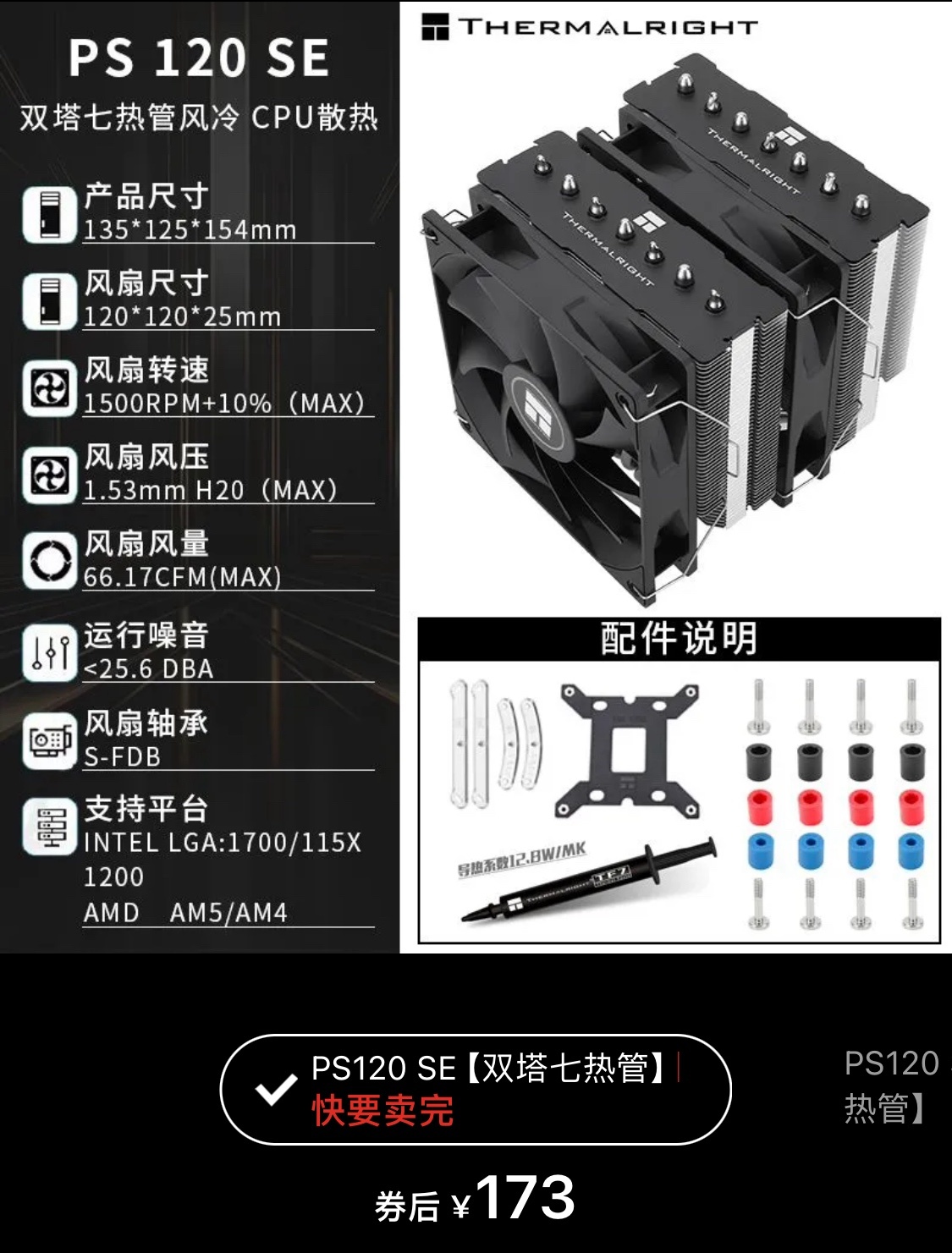 利民ps120se 173元 双12cm风扇双塔七热管镀镍底座 避让内存 推荐使用cpu:14600kf/265k/5700x/7700/9700x