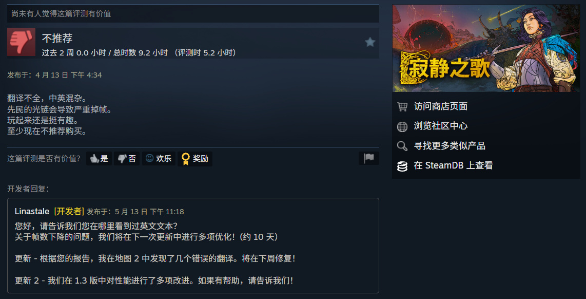 某天被一款游戏的画风吸引,于是一如既往地点开了这款游戏的评论区,筛选差评。我也是第一次见识到了一个游戏开发者在面对差评时候能有多卑微:《寂静之歌》的开发者竟对一条差评“追着杀”!