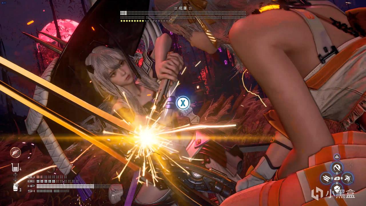 紅蓮進入到二階段後,一刀把蘆葦劈成紅色,已經開始彰顯她可怕的攻擊力了。除了開頭和結尾的定番連招,紅蓮二階段最大的變化就是在之前的連招後面都有追加連段,而且往往是不可閃避的黃色信號攻擊,玩家需要在格擋之前的攻擊後還要進行最終的閃避纔可以完全化解攻擊。而且會追加很多新的連段,也有會進入boss處決的連段等。從一階段到二階段傷害的提高對玩家的閃避能力提出了更高的要求,攻擊慾望也會比一階段要更高一些。玩家需要規劃手中有的資源,比如什麼時候去開迅馳,什麼時候用爆發,在規避傷害的同時,打出最高的傷害。