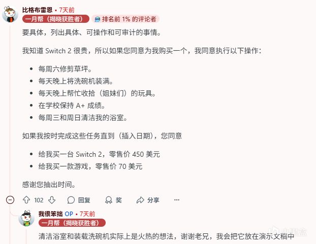 他甚至還補充到 比如有次主動洗碗(雖然剛好被媽媽撞見),他相信只要爸媽想起他這些日子的表現,就會認可他值得擁有Switch 2!