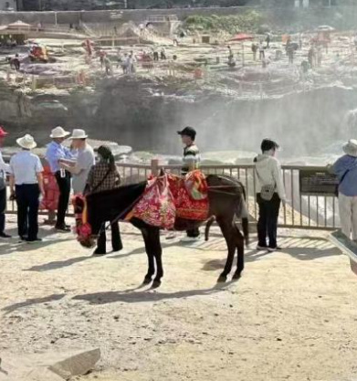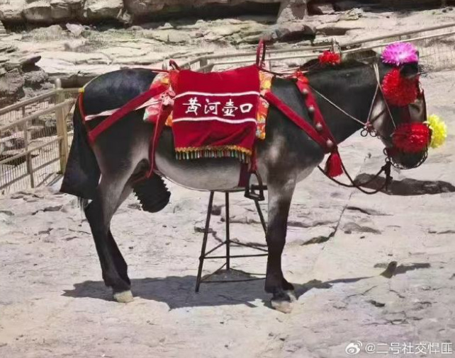 陝西延安,壺口瀑布景區毛驢被穿上“內褲”。網傳原因爲遊客投訴其裸露生殖器官不雅,景區無奈整改。