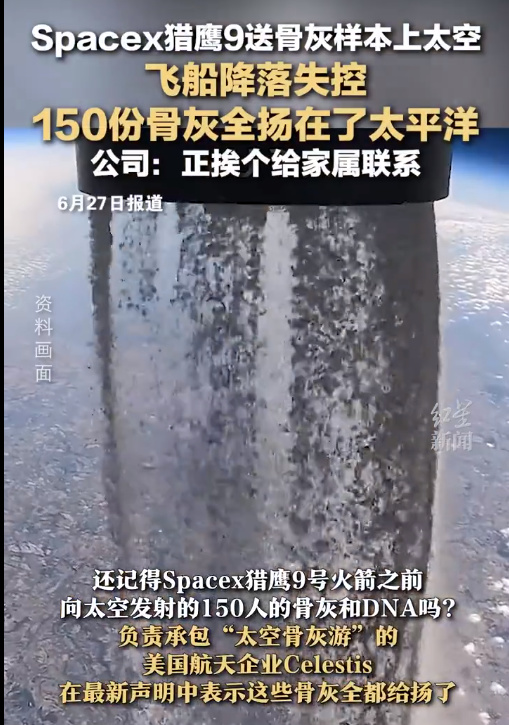 美國Spacex獵鷹9號火箭此前向太空發射了150人的骨灰和DNA。負責承包“太空骨灰遊”的美國航天企業Celestis在最新聲明中表示,他們使用的是德國初創公司開發的新型飛船NyX,雖然NyX順利入軌,但是降落傘系統在回到地球的過程中出現故障,內部裝載的骨灰和DNA散落在太平洋。