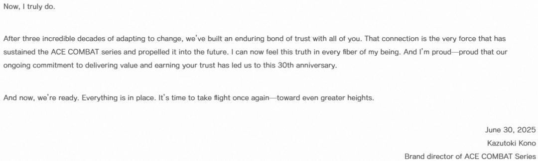 河野引述万代南梦宫创始人中村雅哉的名言"唯顺应变革者方能生存",并坦言:"1994年入职时,我对这句话仅停留在字面理解。如今历经三十载风云变幻,才真正领悟其中真谛。正是这份与玩家建立的信任,成为推动《皇牌空战》迈向未来的永恒动力。我为此深感自豪。"