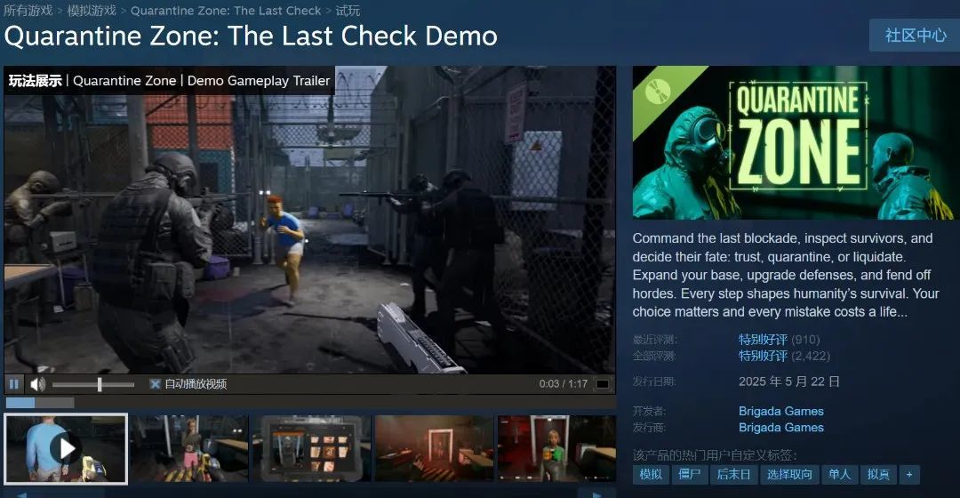 原因也很簡單,這款正式名稱爲《Quarantine Zone: The Last Check》(以下簡稱爲“隔離區”)的遊戲,到目前爲止也只是在上個月公開了一個試玩Demo,並沒有正式發售。