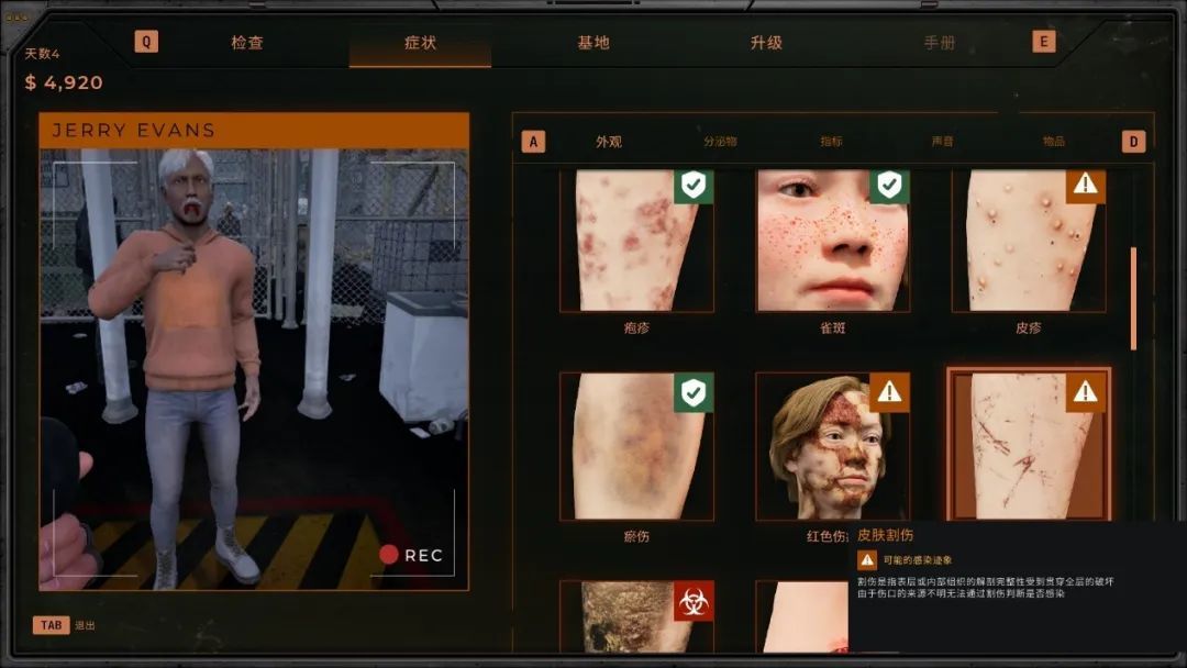遊戲最核心的部分,就是玩家和接受檢查的倖存者們“鬥智鬥勇”,遊戲中準備了相當數量的各類病症:呼吸沉重、體溫升高、角膜充血等等。玩家需要仔細找到每個病症,並判斷是否爲喪屍病毒感染。很多病症還有專屬的小技巧,比如聽診器要聽黑色的病竈,被掩蓋的傷口只有紫外燈照射纔會顯現,還有充滿禁斷感的“透視燈”等等。隨着工具和症狀都逐漸豐富,大家也難免會忙中出錯,漏掉細節。