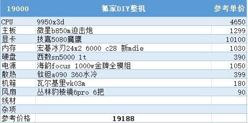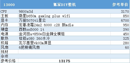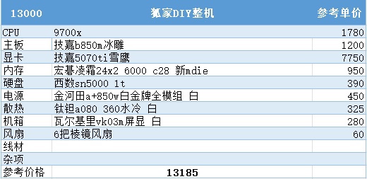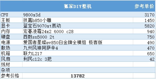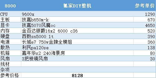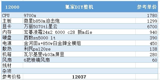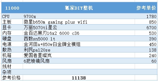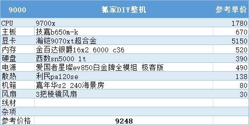 9000元就可以享受到无敌的9700x加9070xt组合了,通杀4k,电源方面注意不要选错了要选极客版,这个版本多一个供电口可以不用一拖二,对于对供电要求很高的9070xt来说还是很关键的。