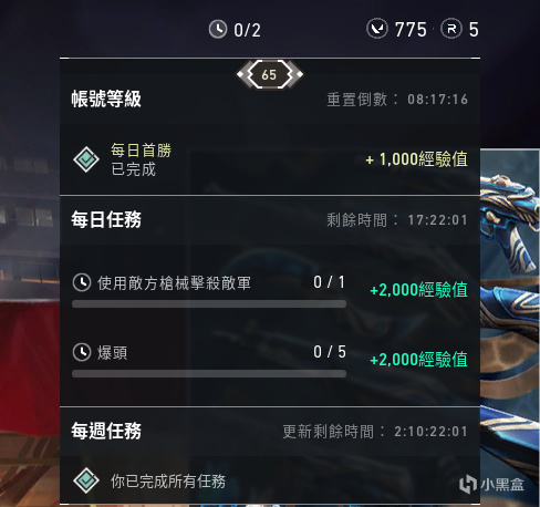 經驗獲取的方式主要就是對局經驗以及每日任務每日首勝每週任務這兩種。一般來說對局經驗其實性價比不高,短時間不能大量獲取,但是後者給的經驗相對來說就比較可觀。這些經驗獎勵除了可以給我上述的特工用於特工解鎖外,還能夠給通行證賦予經驗值用於通行證的升級。另外說一句,每日任務和每日首勝沒做CD一過就刷新了,不會重新補充;但每週任務沒做會一直累計,所以如果有一週或幾周任務沒打都可以在賽季結束前打完。