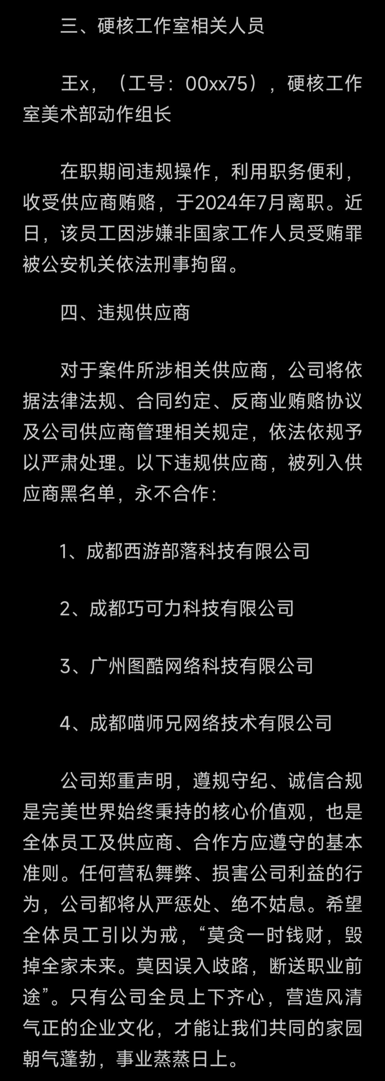 据新浪游戏,完美世界7月1日内部公告,公司查处原百万工作室、青云工作室、硬核工作室相关人员违法乱纪行为。
