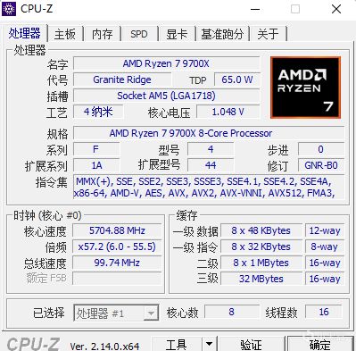 ▼简单看下9700X的硬件参数,8个大核16线程,三级缓存32MB。