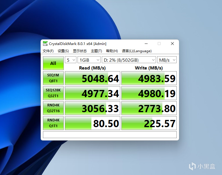 ▼简单跑个DiskMark测试,顺序读取速度5048MB/s、写入速度4983MB/s,4K读取速度80MB/s、写入速度225MB/s。