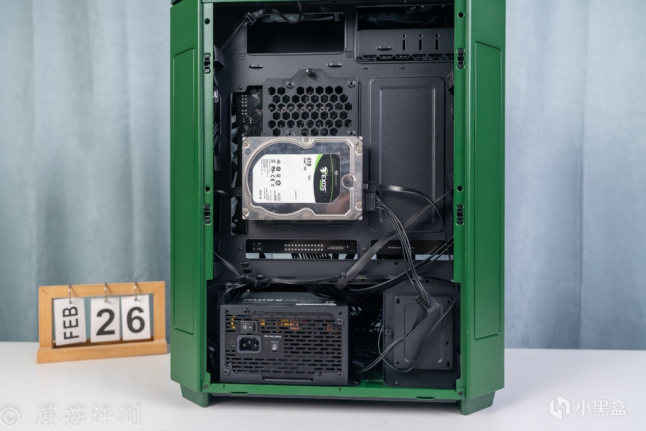 ▼机械硬盘轻松固定到机箱的背面,走线从机箱背面的两侧走,空间很充裕。