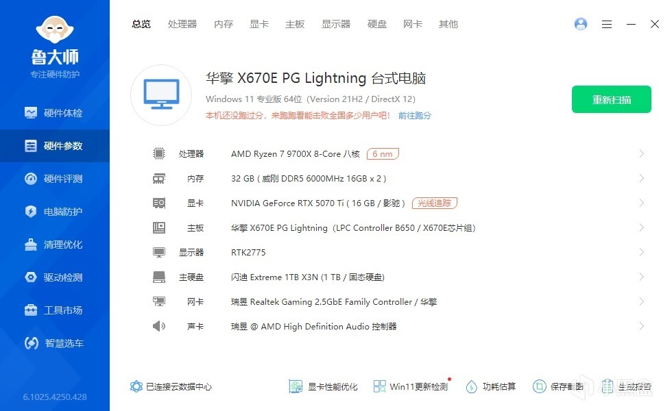 ▼整机配置一览,处理器是9700X,显卡是RTX 5070 Ti。
