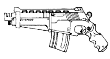450欧元,2米射程,手枪大小的霰弹枪,9.84英寸枪管(250mm),发射20号霰弹,弹匣供弹。该枪在第二次中美洲战争期间研发,用于近距离战斗和清房任务。由于其轻型、无托且短管的设计,射击12米处的目标时减1点精确值,射击25米处的目标时减3点精确值,但是两处距离的命中伤害一致。