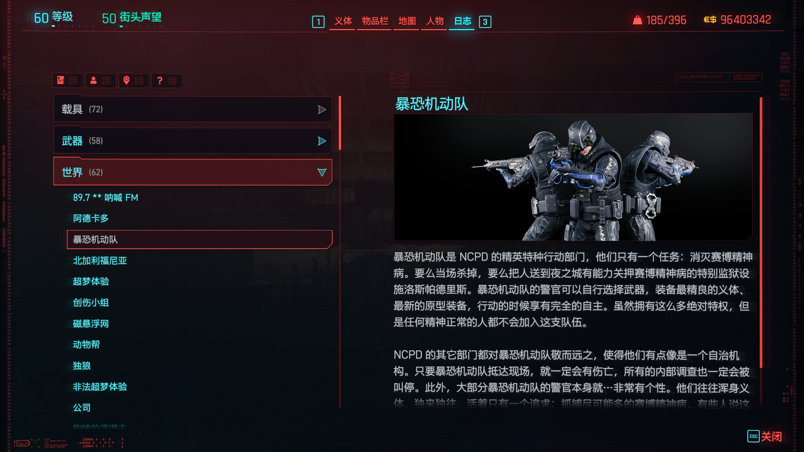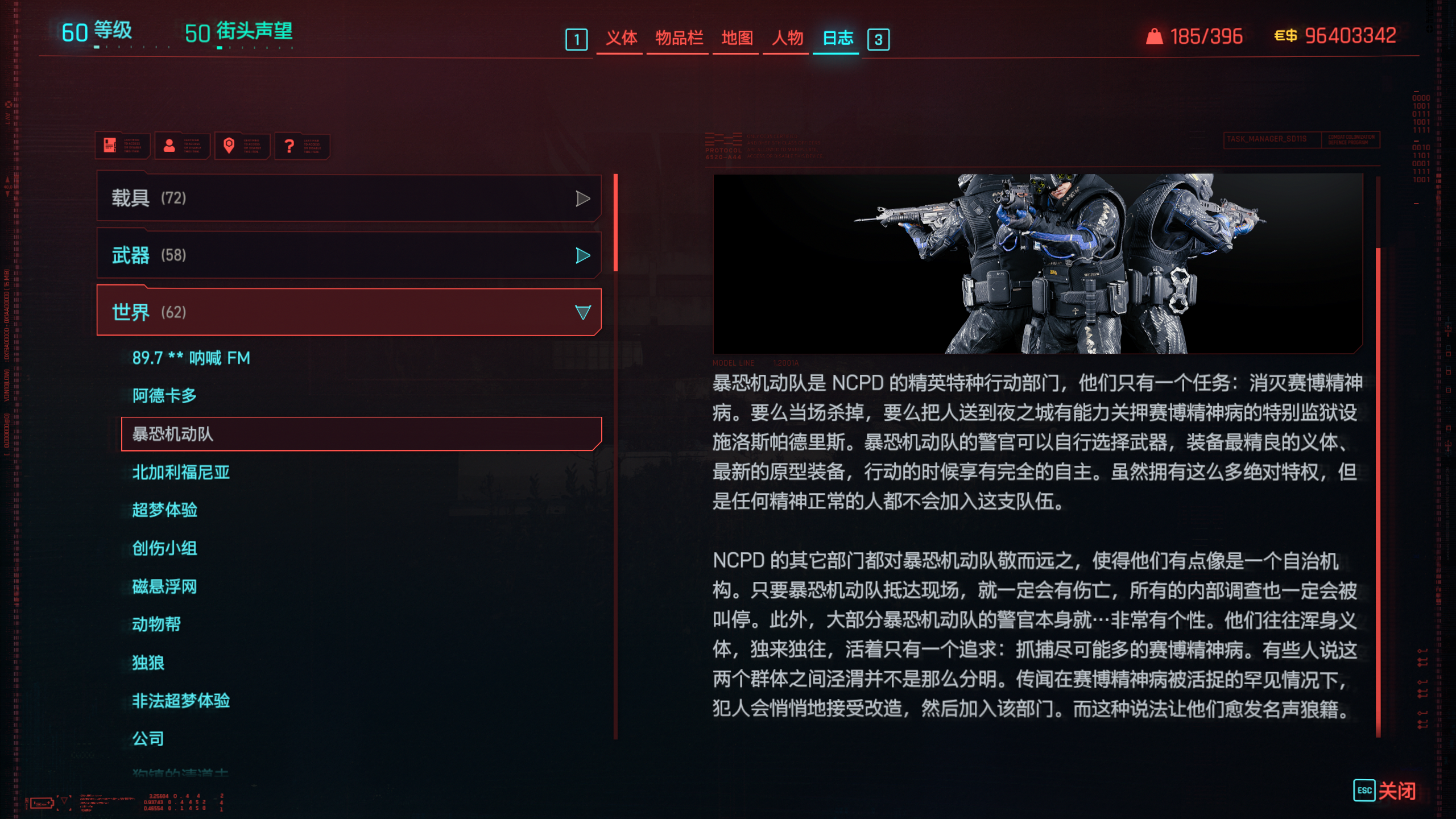 NCPD的其他部门都对暴恐机动队敬而远之,使得他们有点像是一个自治机构。只要暴恐机动队抵达现场,就一定会有伤亡,所有的内部调查也一定会被叫停。此外,大部分暴恐机动队的警官本身就…非常有个性。他们往往浑身义体,独来独往,活着只有一个追求:抓捕尽可能多的赛博精神病。有些人说这两个群体之间泾渭并不是那么分明。传闻在赛博精神病被活捉的罕见情况下,犯人会悄悄地接受改造,然后加入该部门。而这种说法让他们愈发声名狼藉。