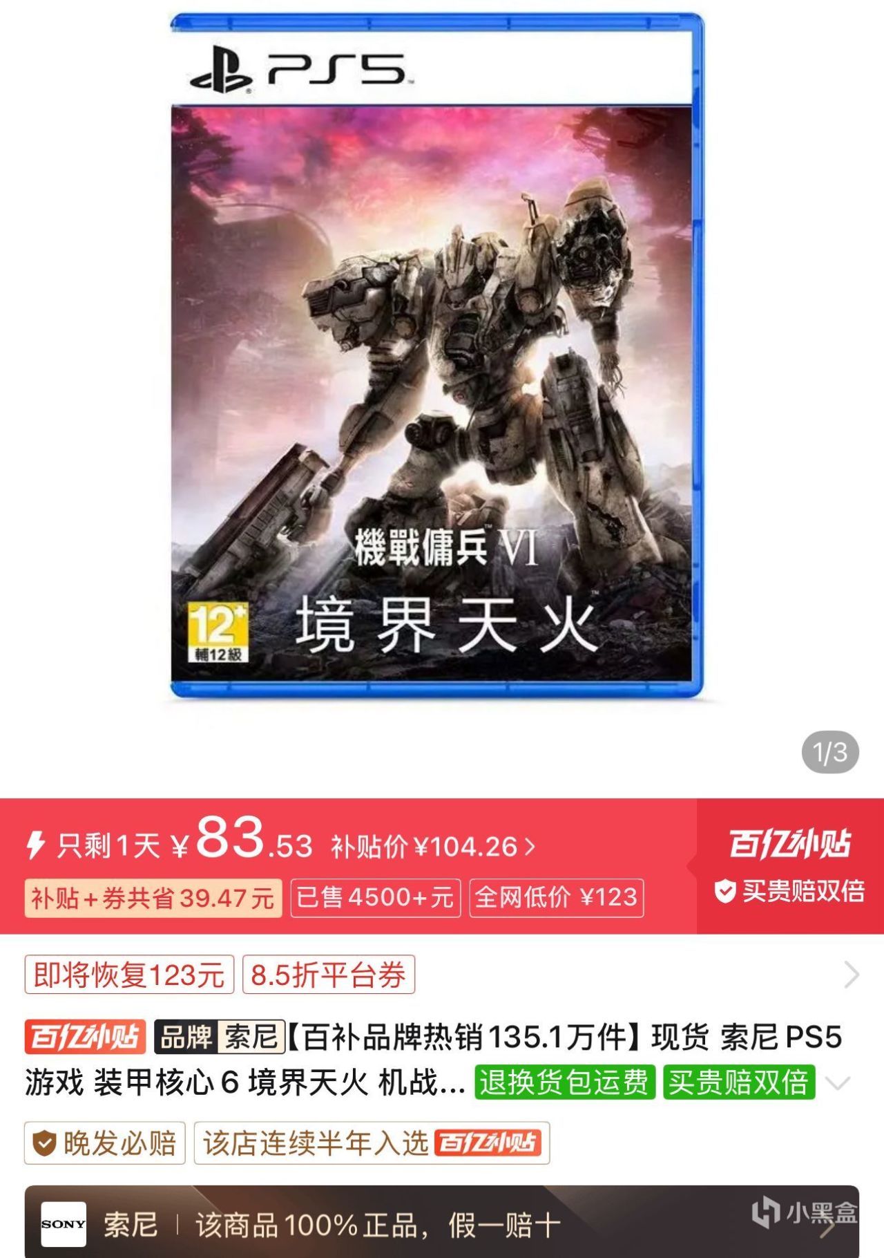 3.PS5《装甲核心6》港版中文83.53元全新包邮,这个游戏属于我这好价推荐阵容里的老熟客了,喜欢硬核机甲的PS5新玩家可以买来玩玩,肯定不亏,我个人很期待该作是否还能进一步降价,例如55元全新包邮就可以跟万代的《海贼王:时光旅诗》坐一桌了。