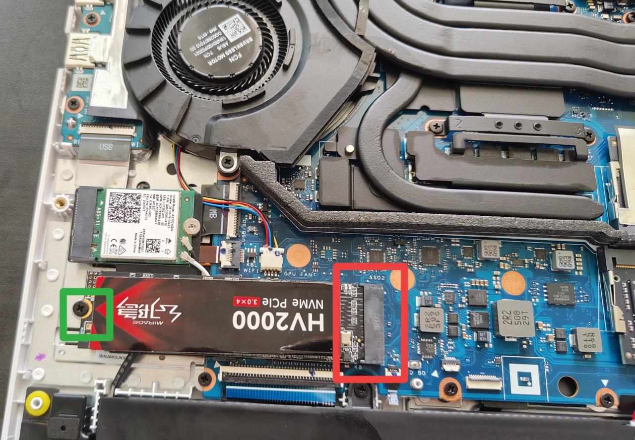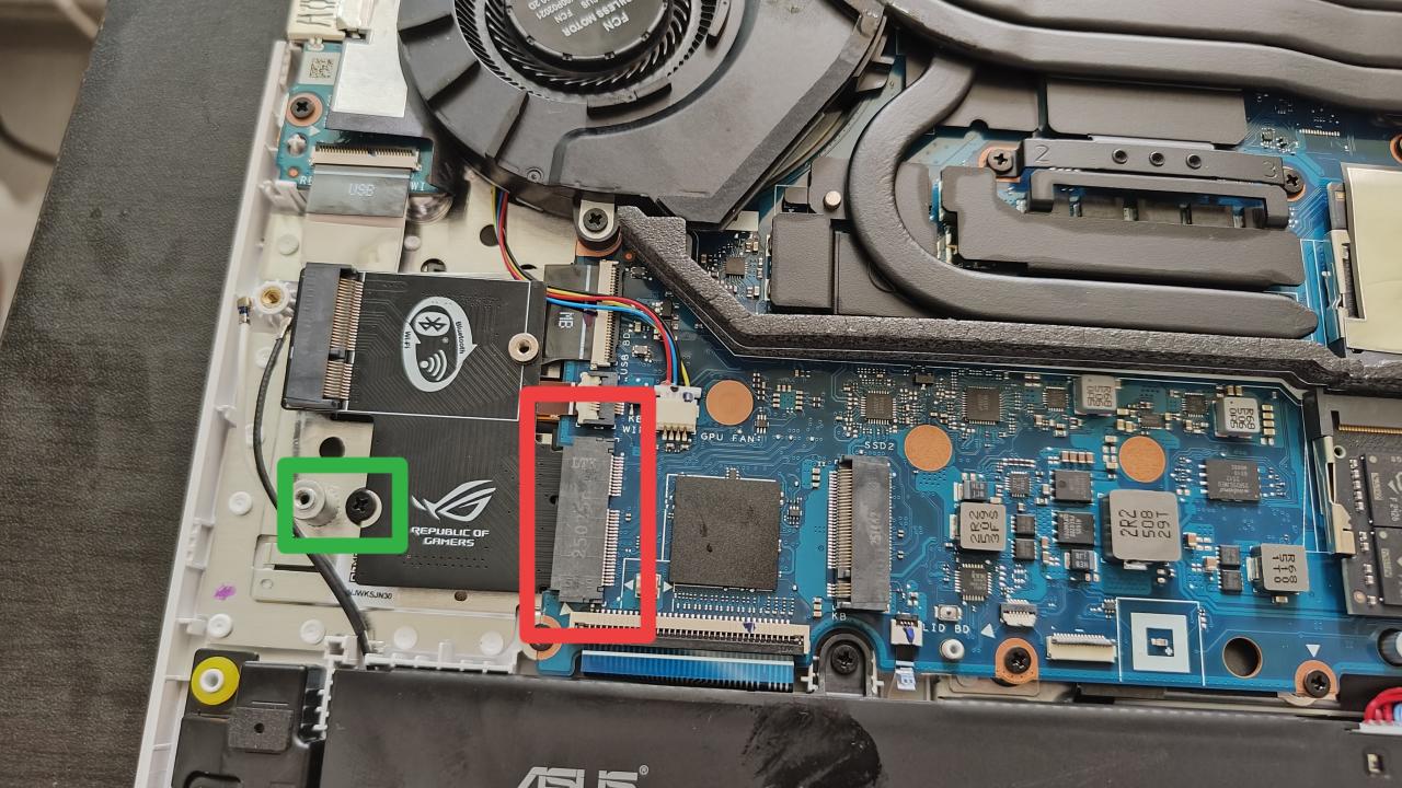 最後裝回固態硬盤(紅色標記位置),擰上副盤螺絲(綠色標記位置)(我原本想讓網卡天線的線在固態硬盤的上面,但嘗試幾次後天線都會掉落,只好讓固態把它壓在下面了 反正下面也有空隙)