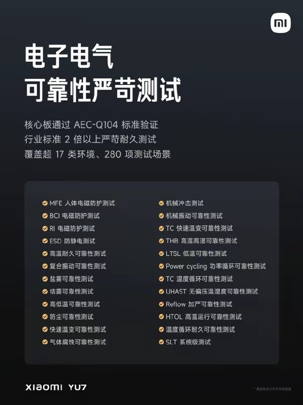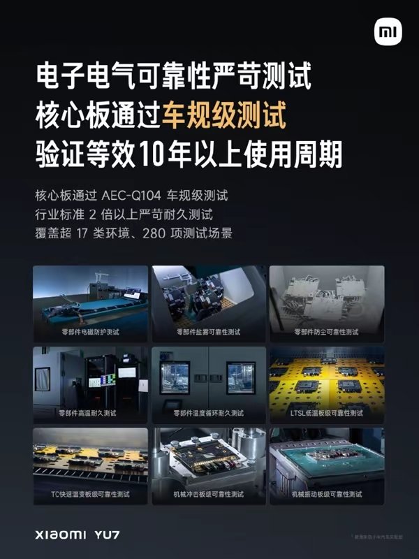 小米YU7搭载的骁龙8 Gen 3处理器也已经通过了AEC-Q104车规级测试,并且进行了超过行业标准的耐久性测试。测试项目包括电磁防护、盐雾、耐高温、温度循环等高强度测试,涵盖了超过17种环境和280个测试场景,确保系统的长期稳定性和可靠性。