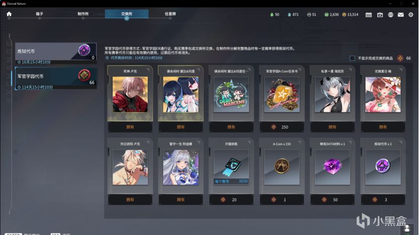 交换所是一个跟通行证紧密挂钩的地方,这里会有一种新的货币:代币,代币是通行证限定物品,每个通行证都会有对应的代币,通行证结束也就代表代币会随之消失,所以根据我之前说的通行证持续2赛季一样,一种代币也会持续两赛季