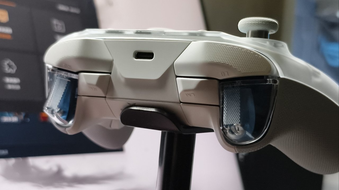 將目光移到手柄的上方,你能發現TYPE—C口還有4個肩鍵與扳機鍵。沒錯是4個肩鍵,兩個正常的大肩鍵和兩個小肩鍵,可以自定義設置,當做一個拓展按鍵使用,對於一些按鍵比較多的遊戲,比如COD,我認爲還是蠻使用的,比如說綁定換彈,對吧。