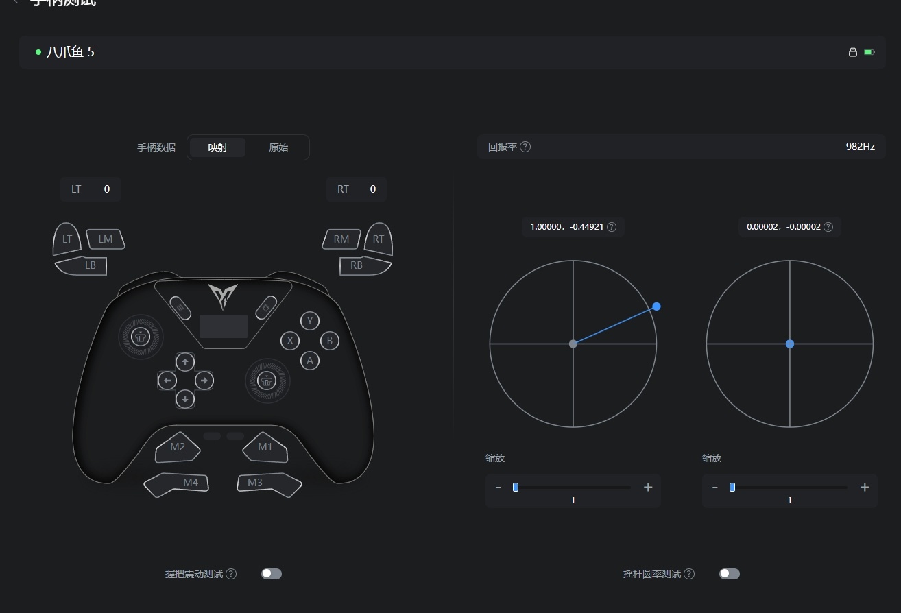 以及對手柄搖桿的圓率測試,握把振動測試,搖桿回報率測試