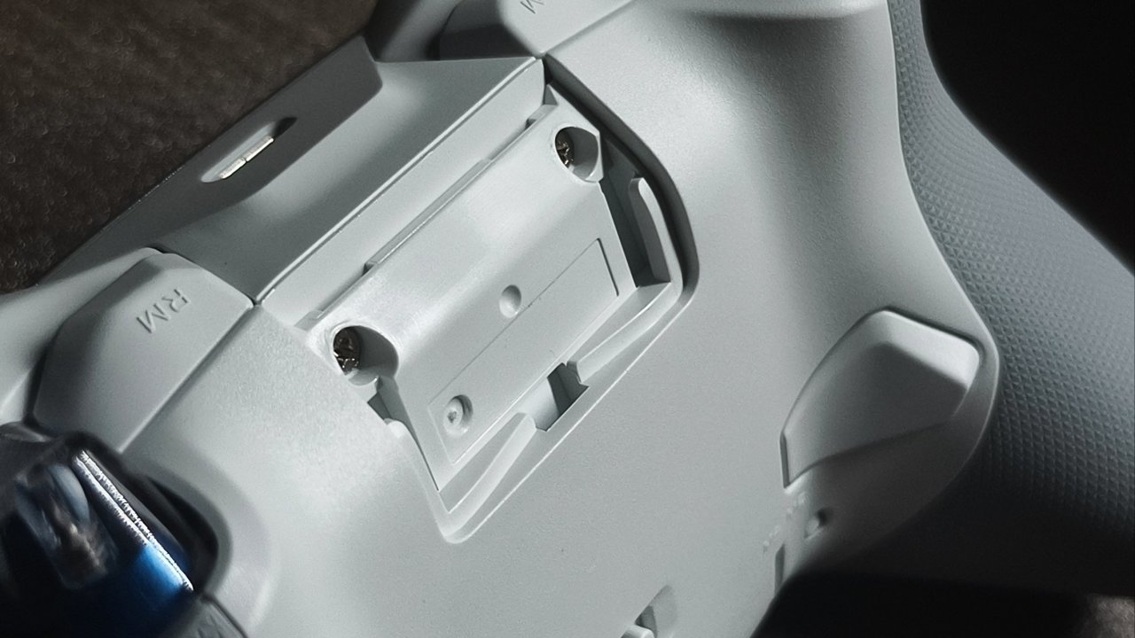 然後就是它的手機支架槽的位置設計的比前代好了,之前的支架槽就設計在手柄頂上,說實話之前確實是有點影響觀感,而現在你會發現在手柄的背面他做了一個和電池倉有點像的設計,把倉蓋拔出,你就能看到新的手機支架槽位了,給隱藏了起來,整體看的舒服多了