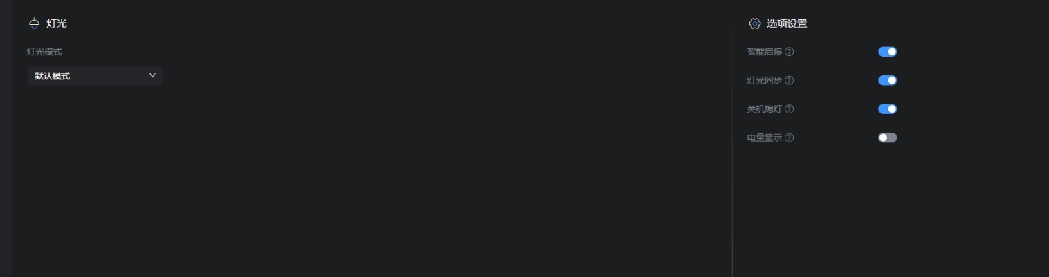 當然除了調節基礎的燈光外,你還能設置這個底座的其他功能,比如說智能啓停/和手柄的燈光同步/關機熄燈/電量顯示。就是有一點我得說一下哈,電量顯示和智能啓停是不能一起開啓的,所以這點大家自行斟酌