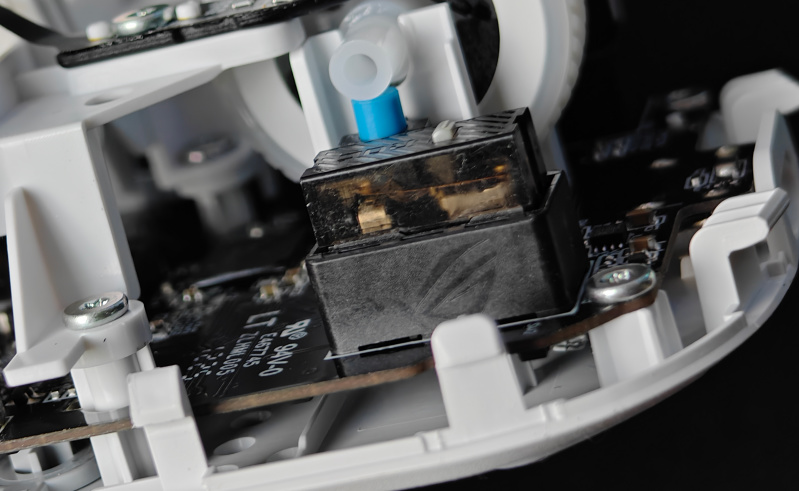 预装的是ROG 2代机械微动,触发的压力比较小,适中,而且偏清脆,回弹很迅速,很跟手,对比欧姆龙第一代光微动要好很多。