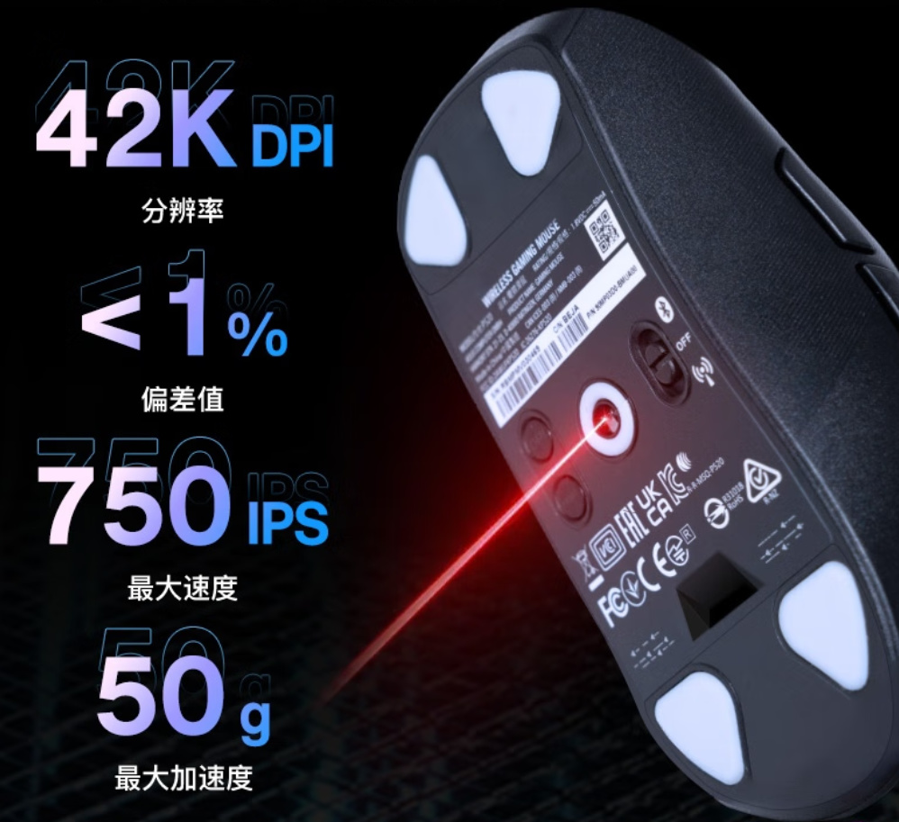 传感器为AimPoint Pro 42K,最高支持42000DPI,750IPS最大速度,以及50g最大加速度。这颗传感器是市面上最强的一批。打不过,肯定不是传感器的问题,多看看录像复盘一下。