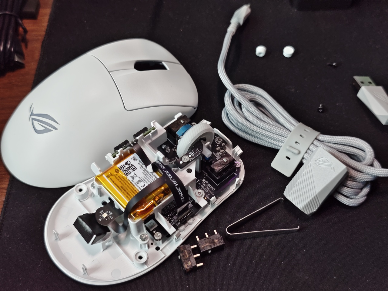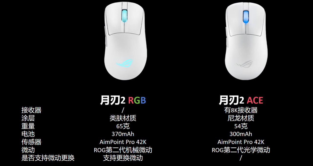 微动方面,ACE版用光微动,微动不可换。RGB版用机械微动,支持微动热插拔。说实话,在高端鼠标上支持更换光学微动和机械微动的鼠标真的不多,ROG一直坚持这个,是很高的加分点。