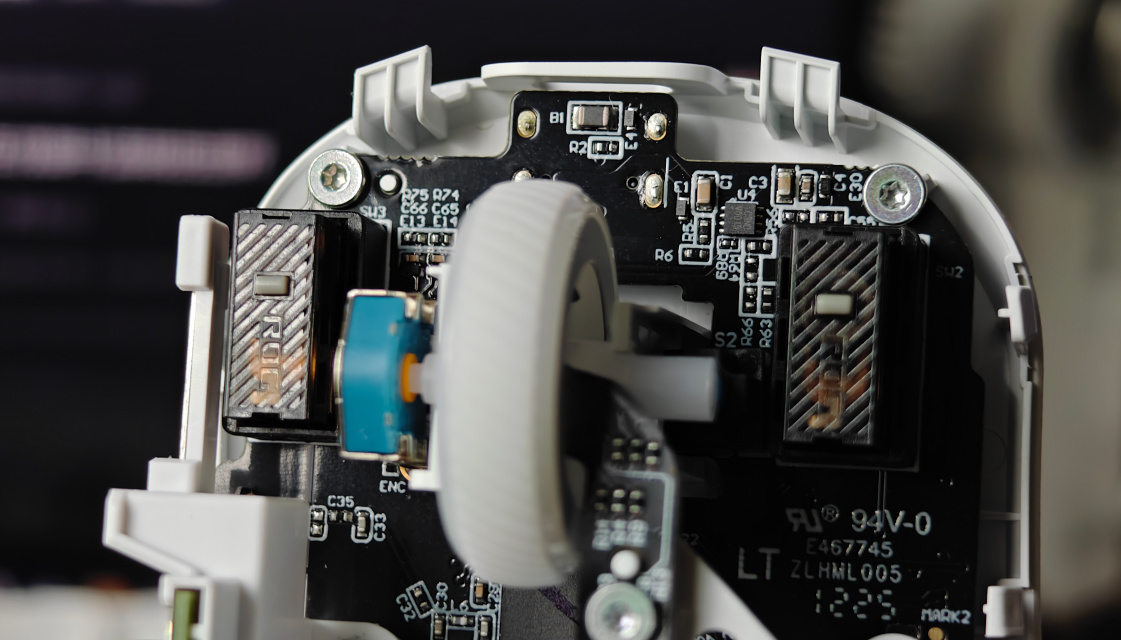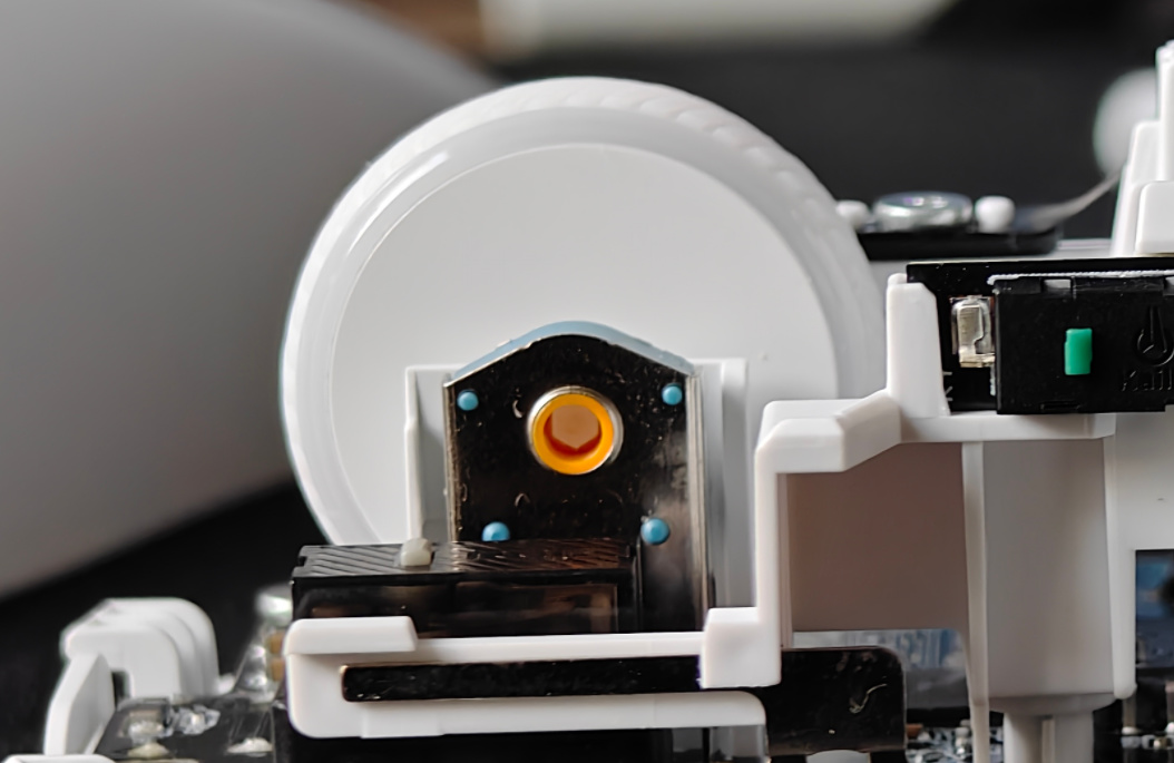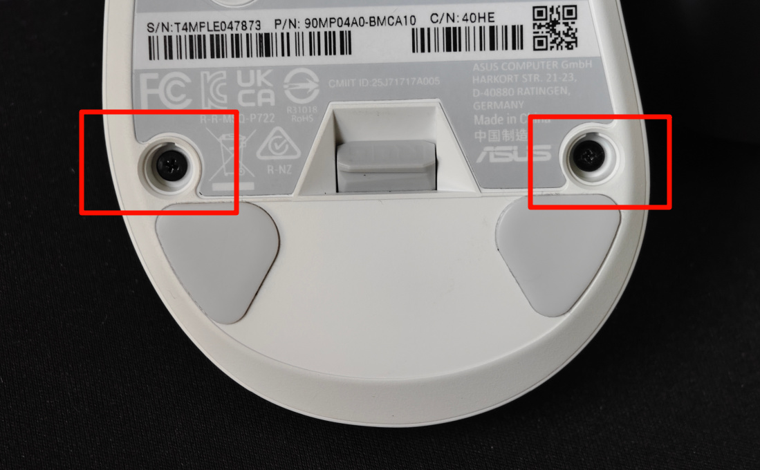 由于设计了微动热插拔,所以鼠标拆解也做了人性化设计。它把螺柱前移,不需要把螺丝藏在脚贴下面了。取而代之的是两个橡胶塞,防止螺丝氧化生锈。