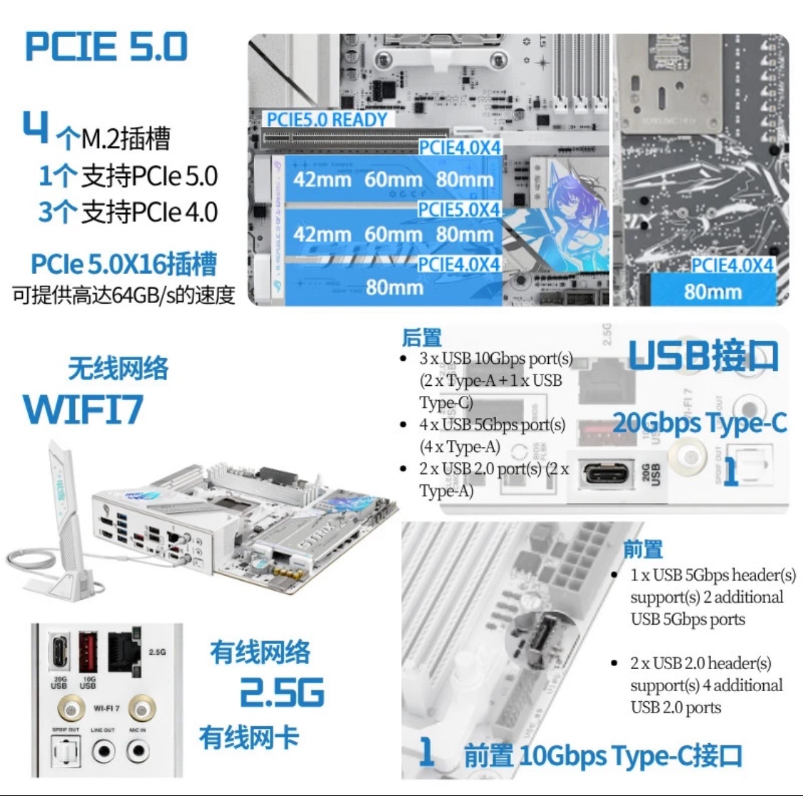 pcie插槽也分为3.0、4.0、5.0,显卡是50系的建议选择5.0的接口插槽,越高传输速度越快。