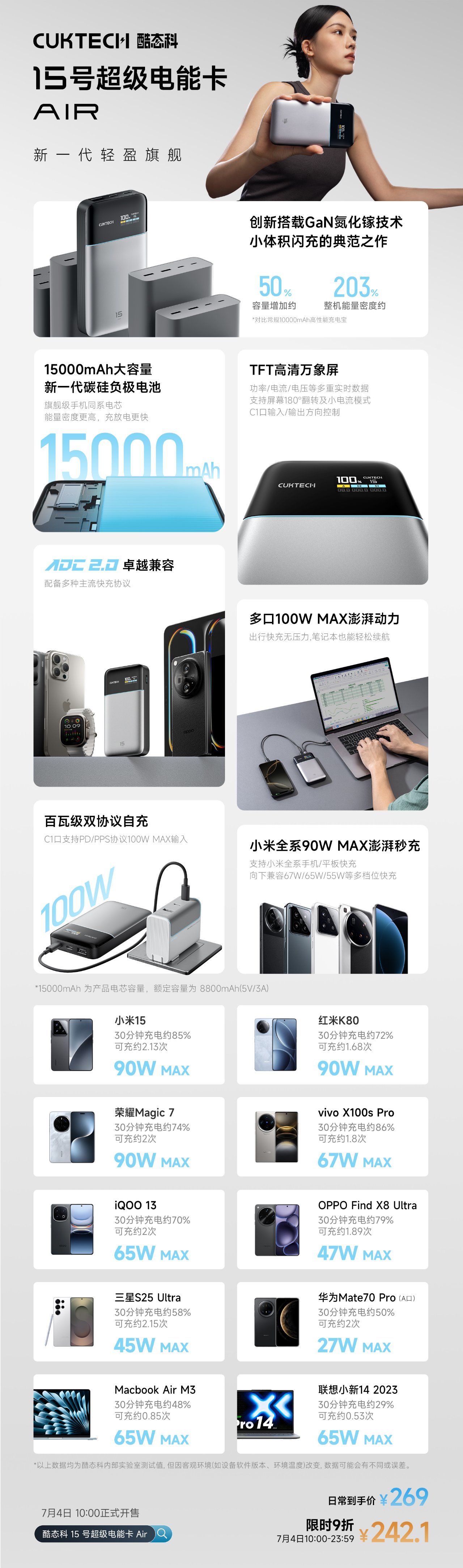 省流:7月4号10:00开售。15000毫安时,100w多口输出,90w单口输出,高清万象屏显,较小体积,价格242。那些既要轻便又要大容量的直接选他。
