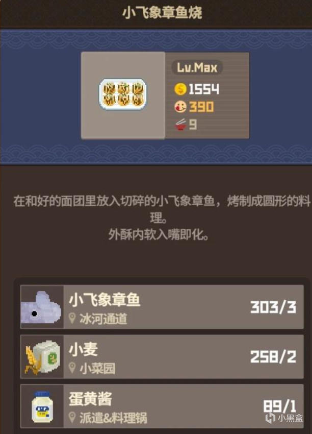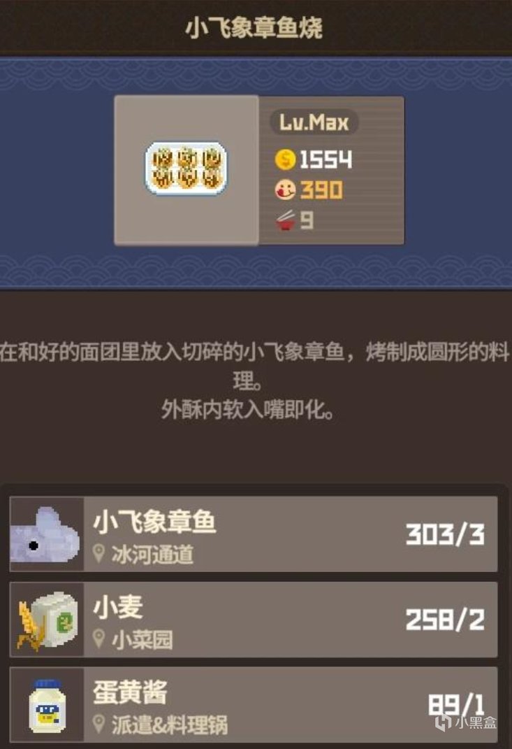 这里以小飞象章鱼烧为例,最上方往下依次是售价(1554),美味度(390),份数(9)