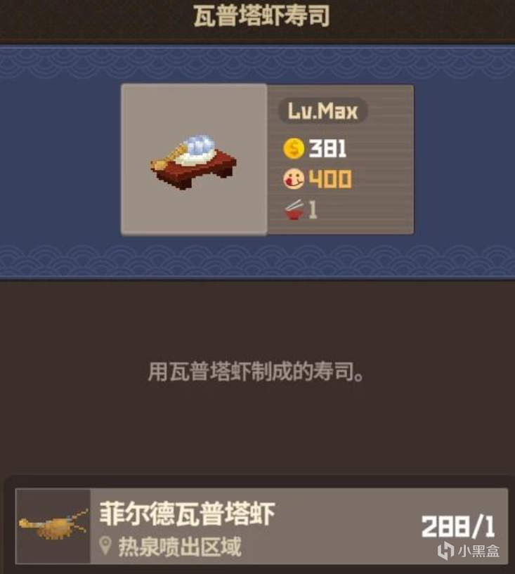 升级钻石店铺375评分料理选择这里推荐瓦普塔虾寿司,这个虾,在热泉区域有很多,获取简单,且不占空间。