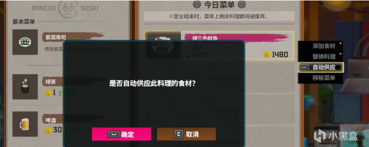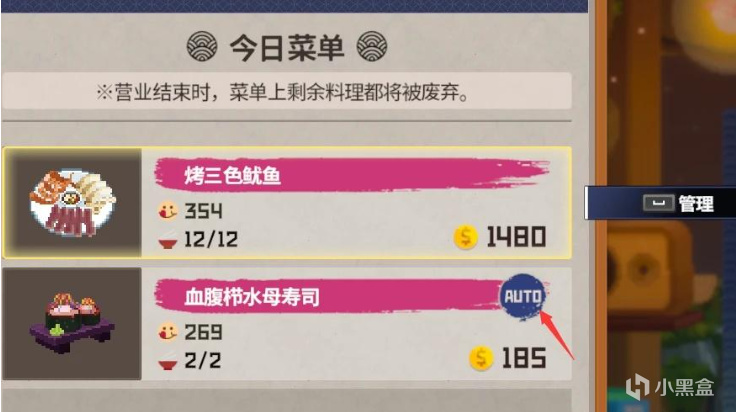 比如我们选择只做一份寿司,选了自动供应在尾部就会有AUTO的标识,只要客人一直来,食材充足,就不用担心菜不够。
