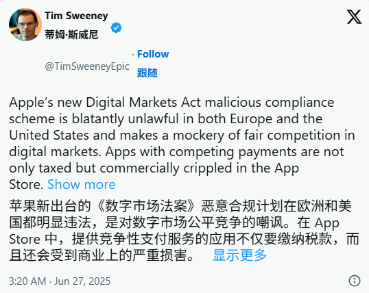 EpicCEO銳評蘋果開放外部支付:“惡意合規,明顯違法”