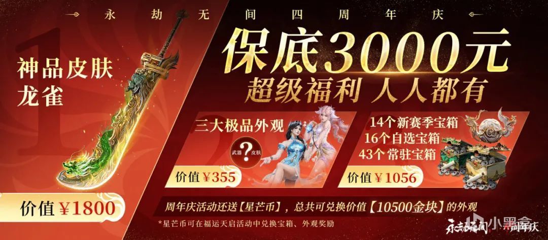 劫寶爲大家算過了,參與上述活動,至少可獲取賽季寶箱*30、常駐寶箱*43!還有機會獲得海量驚喜外觀、總價值525元的自選兌換外觀,這個週年慶保證讓你爽玩、爽領!