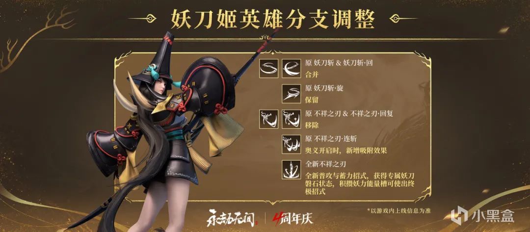 7月9日週年慶版本,新版妖刀姬正式上線:原F1【妖刀斬】、F2【妖刀斬·回】合併,F3【妖刀斬·旋】保留;