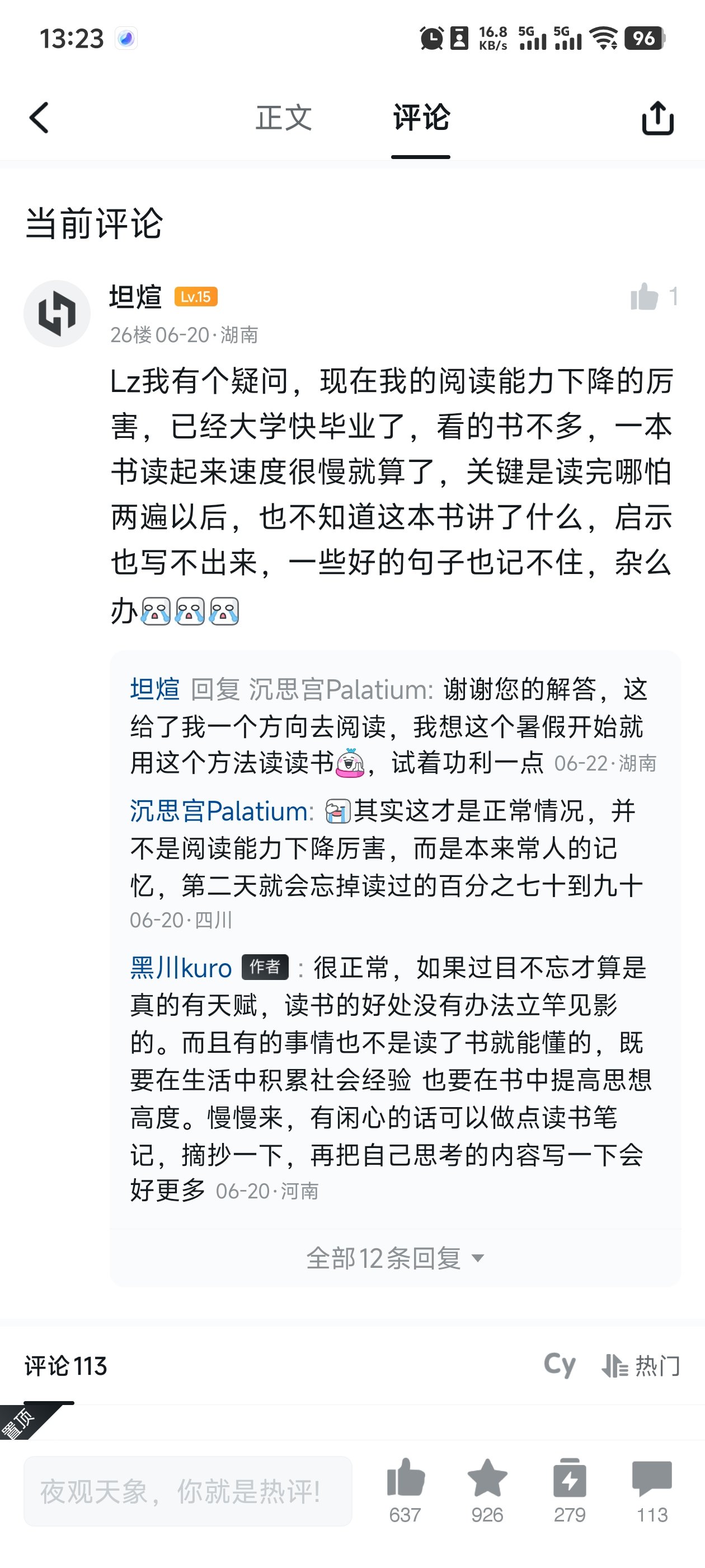 之前有盒友@坦煊求助,(见图)“现在我的阅读能力下降的厉害,已经大学快毕业了,看的书不多,一本书读起来速度很慢就算了,关键是读完哪怕两遍以后,也不知道这本书讲了什么,启示也写不出来,一些好的句子也记不住“,大家也有这样的问题吗?