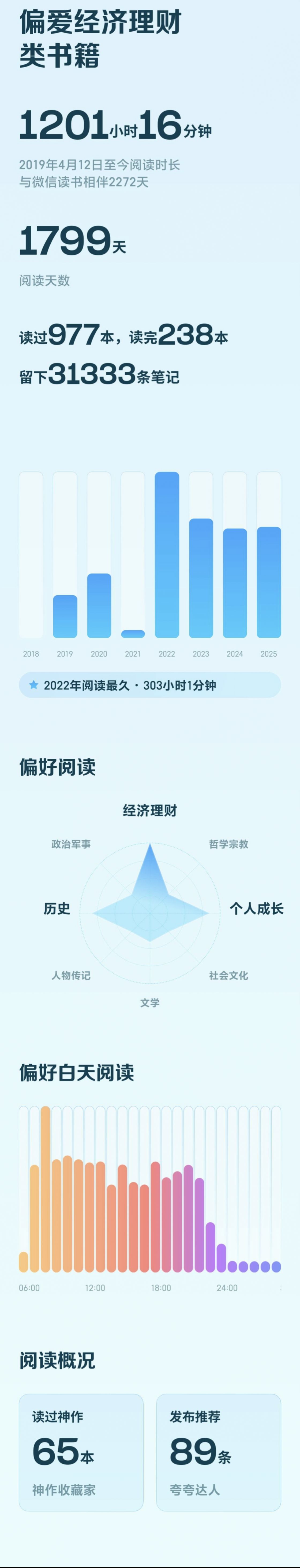我先晒下自己微信读书上的小时数(见图)。私人号上读了一千两百小时(网文两百小时,其他都是出版书籍(不知道为什么统计的是经济理财居多,但其实不是,顶多加了书架)。我还有一个号,上面也有350+小时,不过这个是工作号,主要读古籍、发些书评,没有付费卡,很少用)当然,我不是炫耀,而是证明确实读了一些,总结一下经验教训,帮大家避坑!