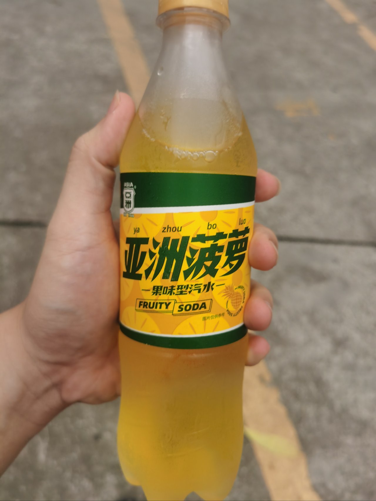 购入价格3r,在超市里还有看到亚洲荔枝口味的汽水,不过最近荔枝吃的有点多了,所以我选择试一下菠萝味的。开盖时逃逸出来的菠萝气味很浓烈,而且能喝到一点发酵的感觉,和菠萝啤非常相像,入口就更是相似了,只不过是没有菠萝啤那么绵密的气泡,不过相较于菠萝啤,它的甜度会更甜一点,而且在吞咽之后喉咙处会感觉到很黏腻,个人认为没有菠萝啤好喝hh