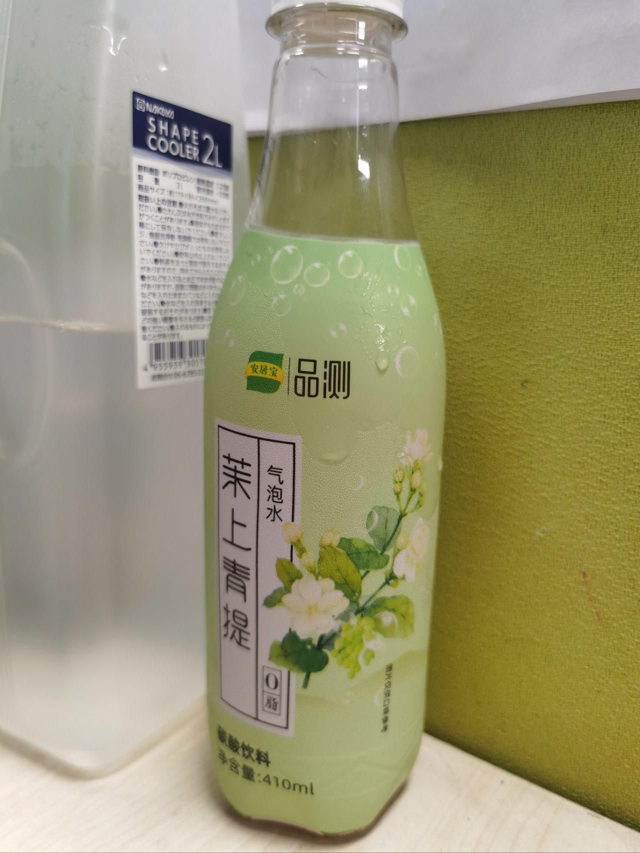 在pdd闲逛的时候看见的,临期产品所以价格非常便宜,5瓶才5.18元(本栏目现阶段最便宜的饮料)。这个饮料的颜色有点偏红,包装上有明确写明是碳酸饮料,打开瓶盖之后能闻到一股很浓的青提味,但是入口之后气泡并不绵密,而且味道有一点杂,喝起来给我一种没什么气泡的美年达的感觉,不仅有着标题上的葡萄味,还会喝到一点点苹果汁的感觉,看了一下配料表,原来里面有加浓缩苹果汁(怪不得了),配料表里还写了酥油加茉莉花茶,但是说真的果浆加的有点多了,实在喝不太出来,茶味很淡很淡(几乎没有),只能说就是一很普通的小甜水。