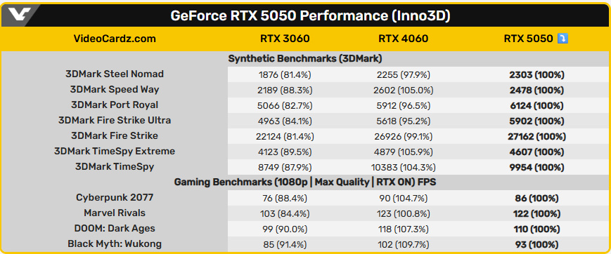 这款RTX 5050曜夜X2安装在9800X3D和DDR5-6800系统上进行测试,映众在总结中谈到,根据测试,RTX 5050实际综合性能略低于RTX 4060,即使它在基准测试中表现不错,但真正游戏中还是RTX 4060更胜一筹。