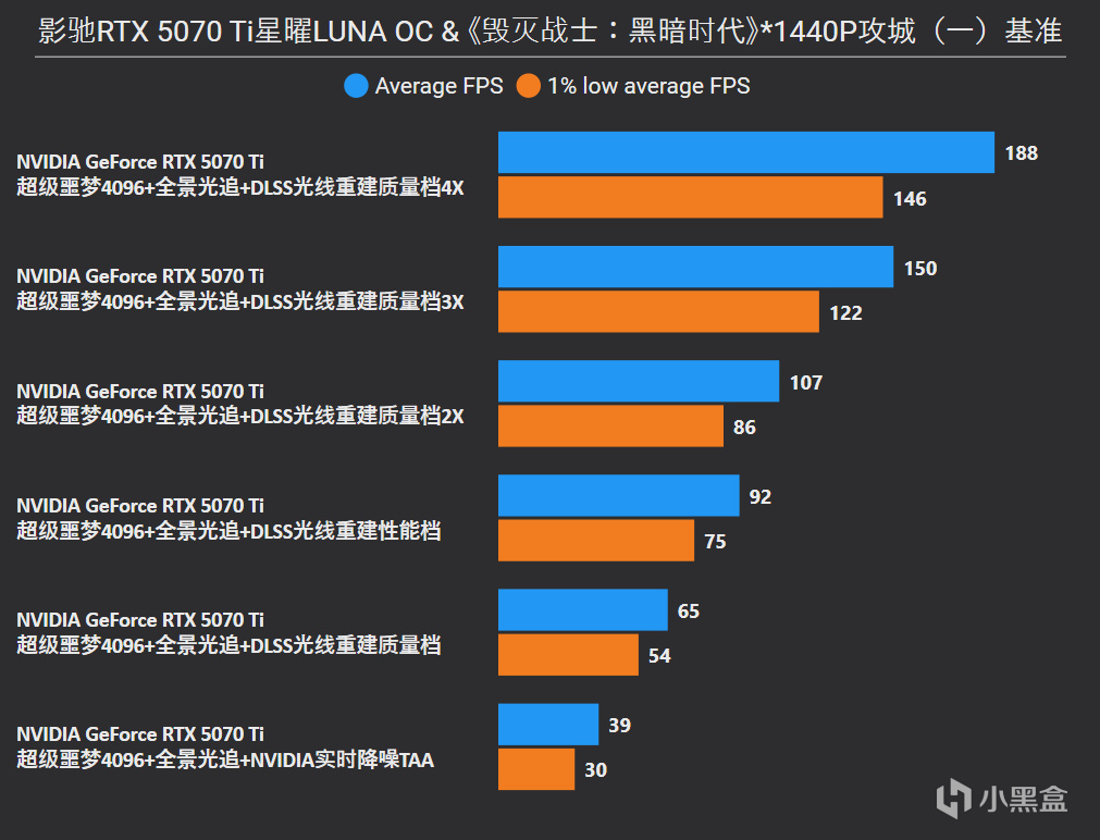 1080P分辨率,对于RTX 5070 Ti来说路径追踪在原生状态下完全可以一战,平均达到59fps已经属于流畅及格线,借助DLSS光线重建性能档甚至已经达到高刷入门水平,不过对于1080P更建议使用质量档。开启DLSS质量的2X倍率后,提升幅度相比TAA有2.54倍,3X倍率是3.57倍,最后4X倍率是4.42倍,大可放心插帧。