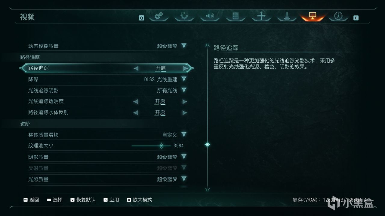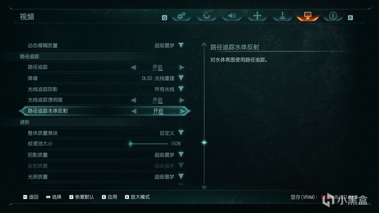 新增的路径追踪位于预设画质上方,降噪就包括NVIDIA实时降噪和DLSS光线重建,两者在技术原理、画面效果、动态处理等方面有着巨大差异,后者顾名思义是和DLSS画质提升绑定同步开启的,也是利用了Transformer模型。光线追踪阴影、光线追踪透明度和路径追踪水体反射这三项主要影响画质,下面会通过画面实测对比来看下具体差距。