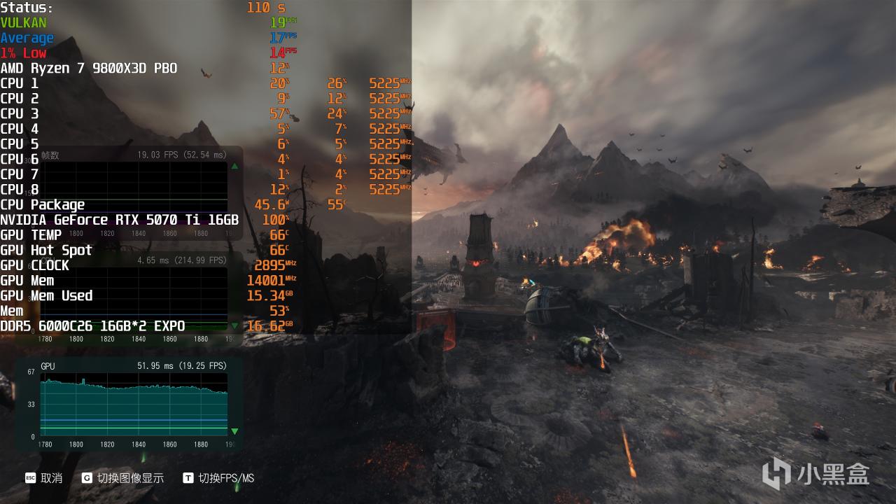 测试平台方面,直接搭载AMD锐龙7 9800X3D,设置开启PBO ENABLE,搭配两根DDR5 6000C26 16GB*2内存,足以确保CPU是最小瓶颈,操作系统是Windows 11 24H2最新版本,显卡驱动是NVIDIA GeForce Game Ready 576.80 WHQL ,该版本就是针对《毁灭战士:黑暗时代》新增路径追踪和DLSS光线重建。