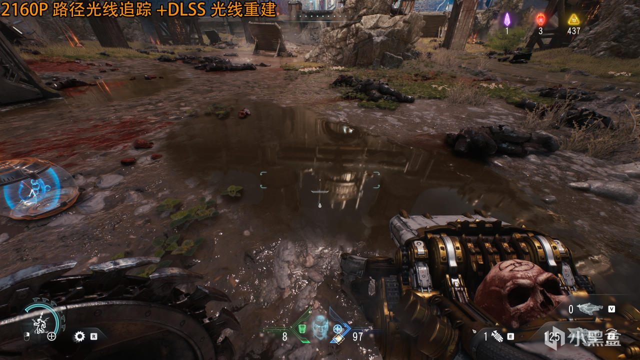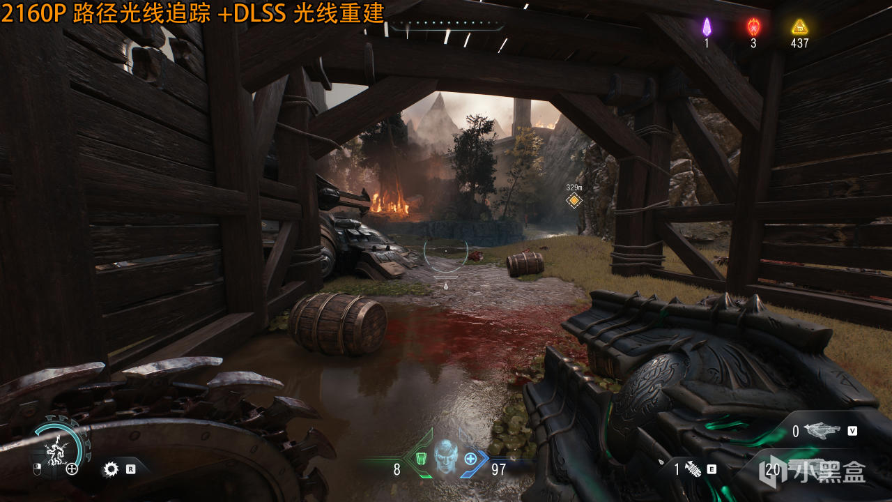 首先是一个室外场景——处于木制哨岗下方,无路径追踪时,光线显然只是太阳光照射到积水表面形成倒影,没有二次光线反弹,玩家直觉会认为画面已经很完美。其实打开路径追踪才是真实物理规律——在积水表面会形成二次、三次甚至更多路径,比如整个哨岗的木质面、主角武器形成的间接光照,但是依靠NVIDIA实时降噪,反射倒影很模糊,利用DLSS光线重建就清晰不少了。