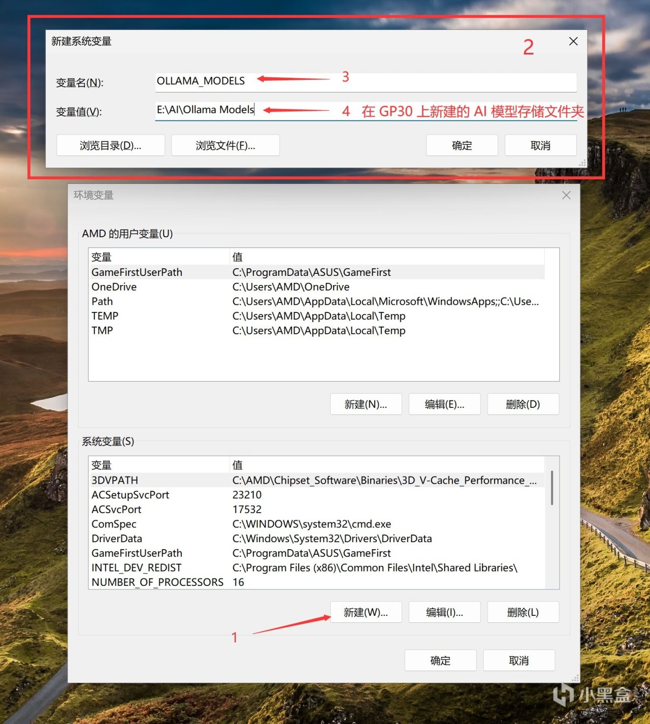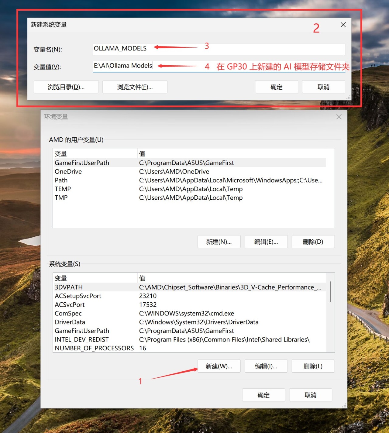 然後要在 3 所指向的位置輸入“OLLAMA_MODELS” ——特別注意,這段文字前後都不能有空格以及符號!