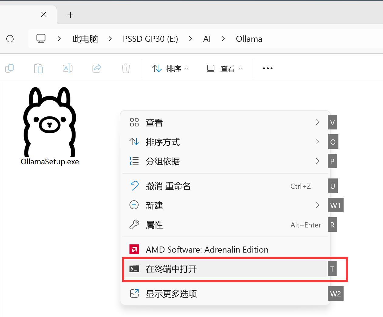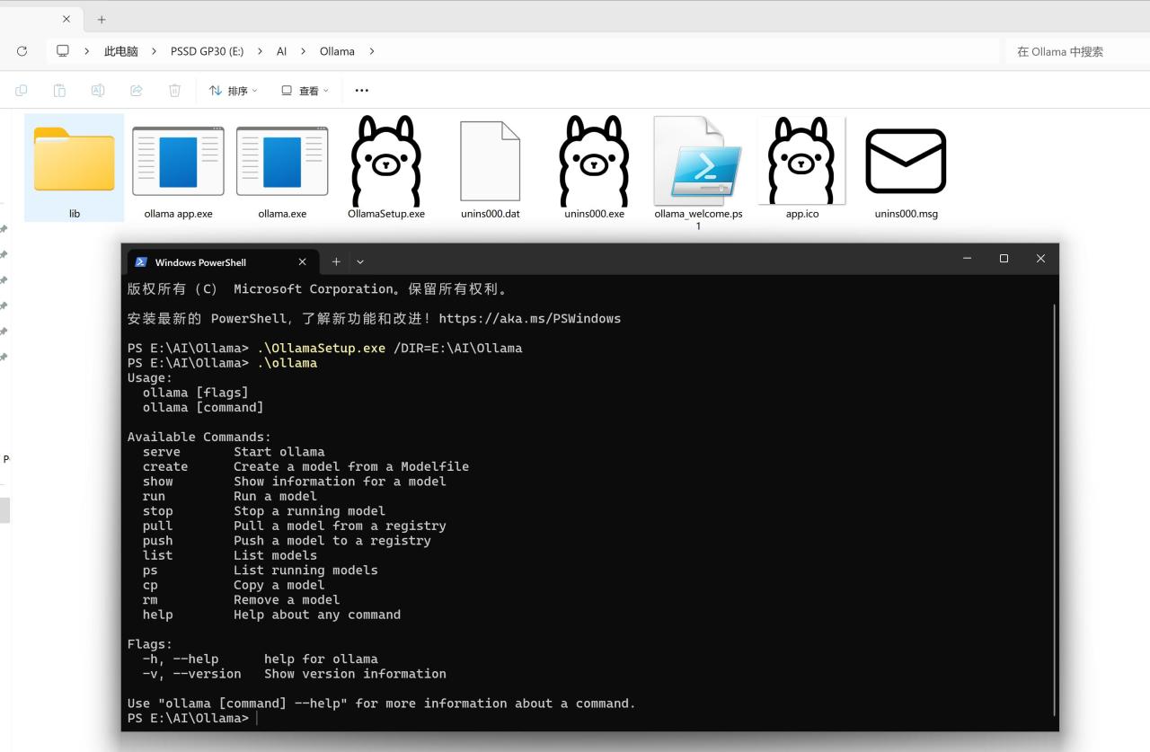 AppDataLocalProgramsOllama”。其實 Ollama 也可以安裝到其他盤上,比如這次的宏碁掠奪者 GP30 2TB PSSD 上。本次 PSSD 在 E 盤,所以在 E 盤新建了 AI —— Ollama 文件夾,並把最新的 Ollama 安裝程序移動到這個文件夾。