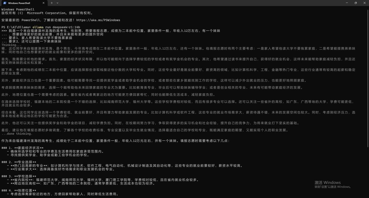 複製入指令 “ollama run deepseek-r1:14b”,經過一段時間漫長的等待後,完成了 DS R1 14B 的大模型下載。
